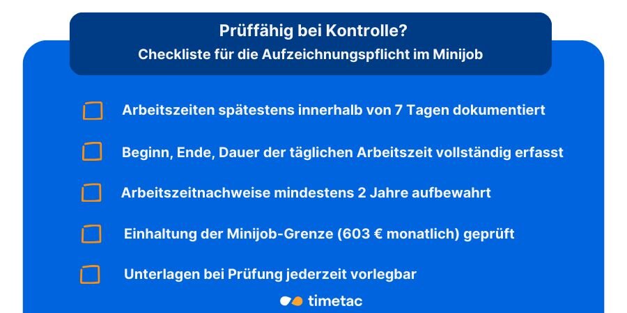 - Arbeitgebende müssen einen Stundennachweis für Minijobber führen (Beginn, Ende, Dauer)
