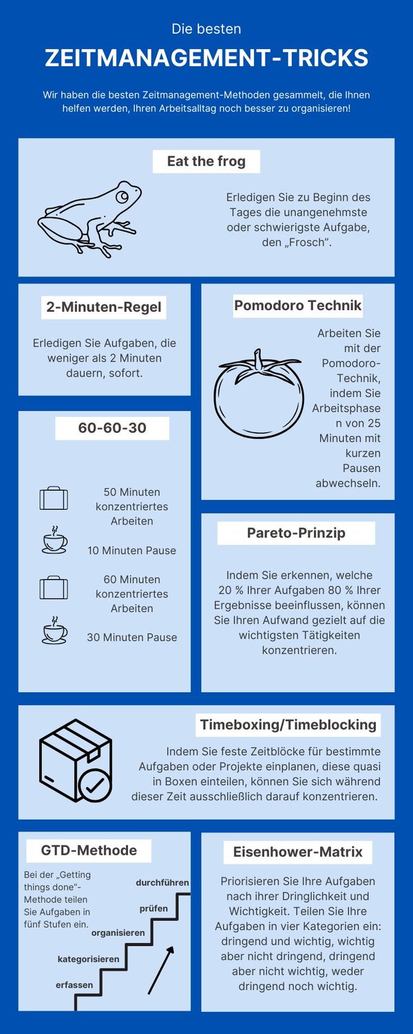 Mit diesen praktischen Zeitmanagement-Methoden können Sie Ihre Aufgaben effizienter erledigen und Ihren Arbeitsalltag besser organisieren. Wählen Sie die passende Methode je nach Aufgabe und bringen Sie Ihr Zeitmanagement auf das nächste Level.