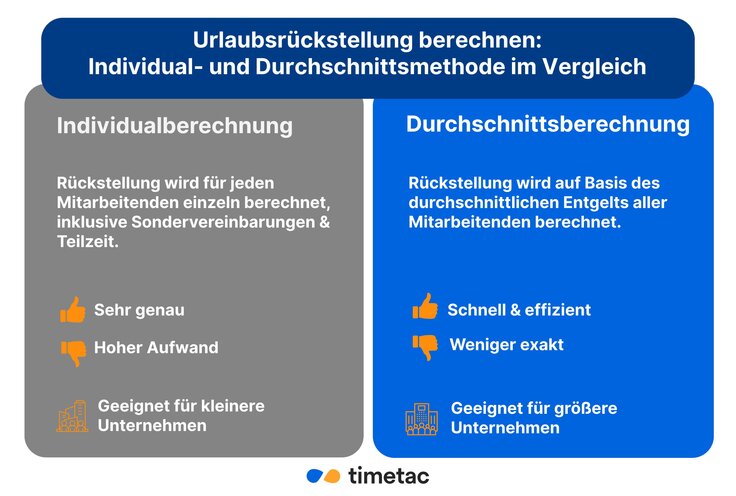 Individualberechnung: Vor allem bei kleineren Unternehmen sinnvoll. Die Rückstellung wird für jeden Mitarbeitenden individuell auf Basis des Jahresgehalts und der offenen Urlaubstage berechnet. Dadurch ist die Methode sehr genau, aber auch zeitintensiver.