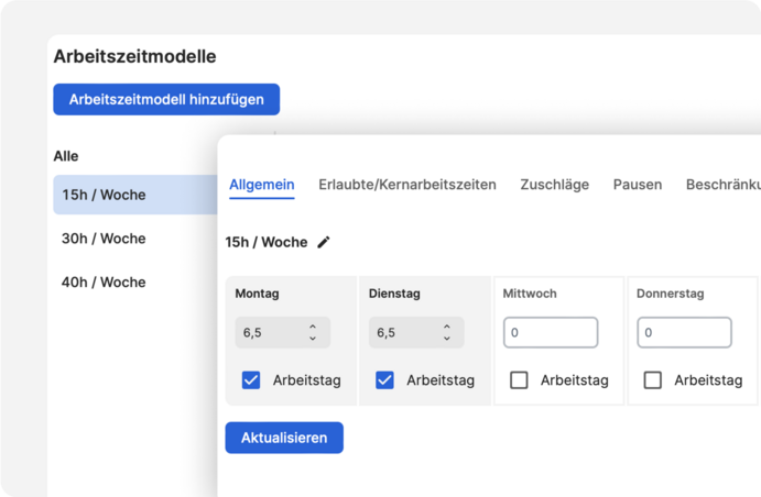 Erstellen Sie beliebig viele Arbeitszeitmodelle mittels Vorlage oder individuell und entsprechen Sie sicher den gesetzlichen Vorgaben Ihrer Region.